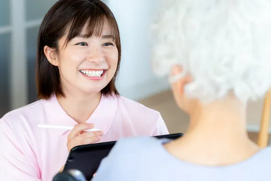 食前の服薬、嚥下状態の確認、水分摂取の促しなど、介護職と連携したケアをします。