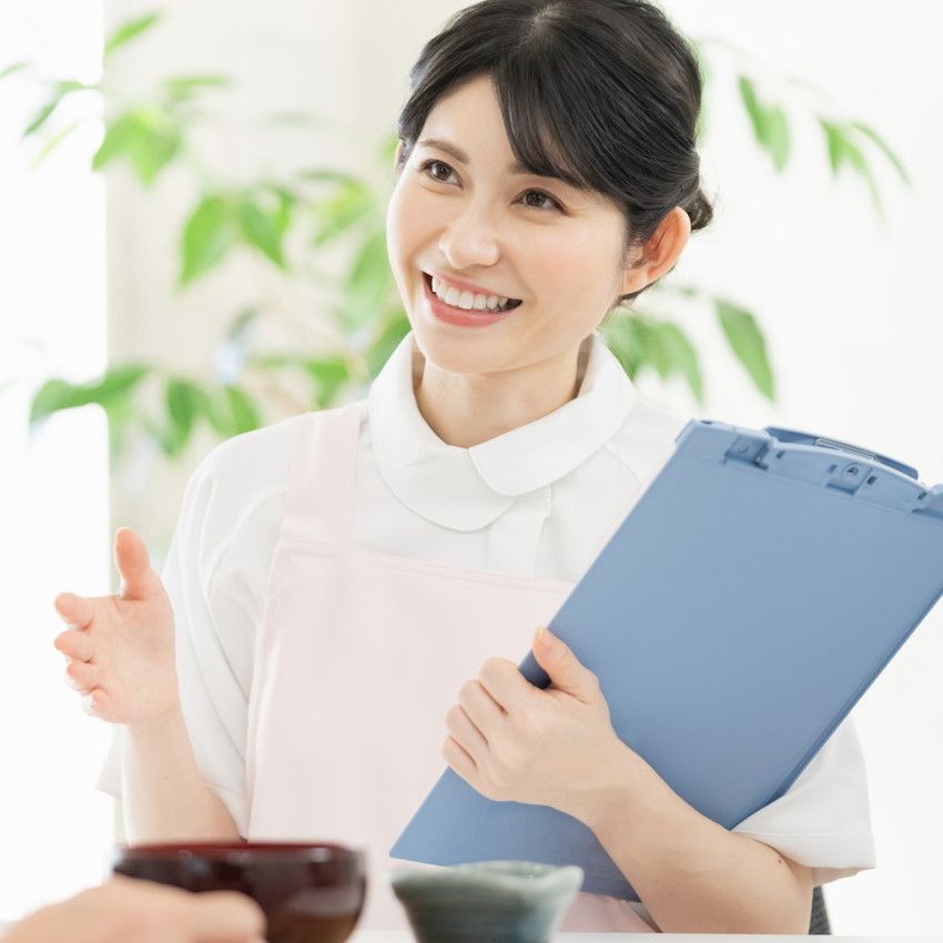 新鮮な食材、栄養バランスにこだわってご利用者さまが食べるお食事のメニューを考案いただきます。考案したメニューに沿って、調理スタッフと連携してご利用者さまに提供します。