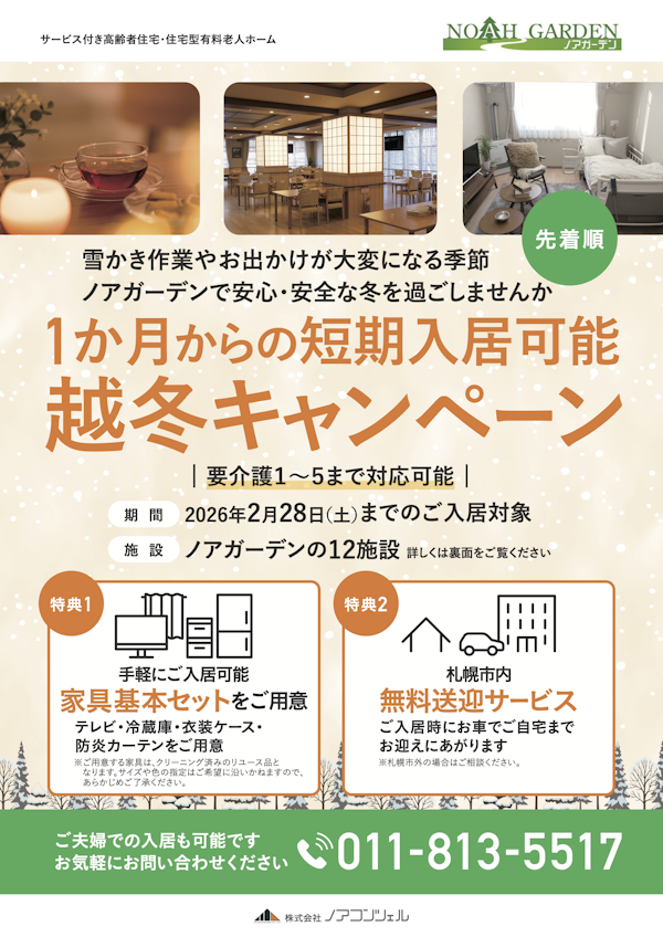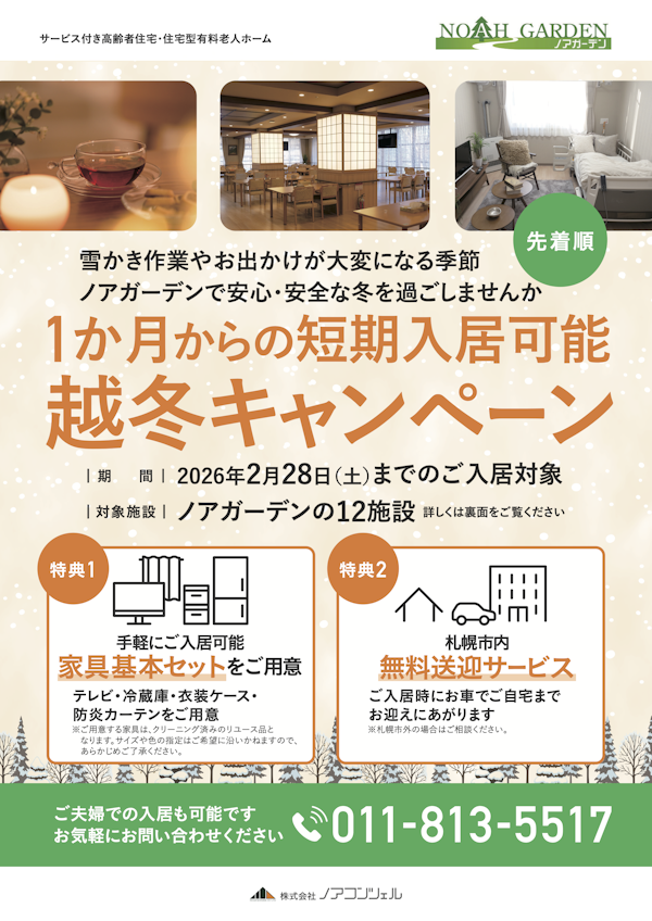 11月10日以降にお問い合わせいただいた方を対象に、1ヶ月からの短期入居が可能な「越冬キャンペーン」を実施いたします。
